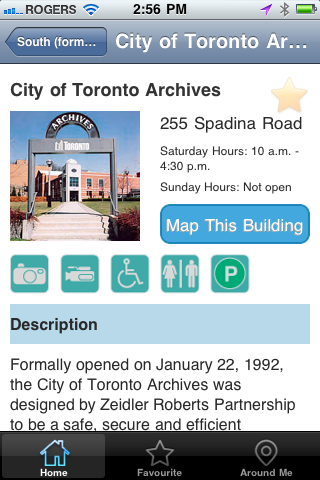 Each building displays a picture of said building, the address, opening hours throughout the weekend, a "map it" option, add to your favourites, the description and additional information about the building. To help plan your visit to Doors Open Buildings we also let you know the building facilities including if the building is accessible, are washrooms available, if there are parking, are photos allowed and is filming allowed. If available we include the architect and architecture style and the date of building construction. We also provide the nearest subway and street car stop for most buildings along with the buildings contact phone number if available.
